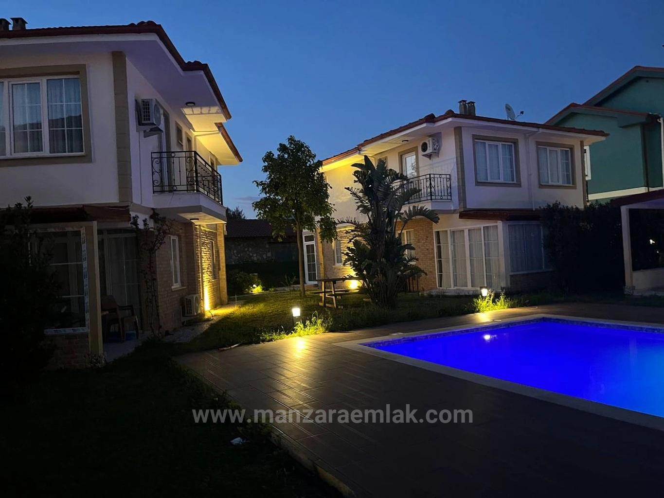 Site içinde ikiz villa, dubleks, ortak havuzlu. 80 m2 brüt, 70 m2 net alan. 1200 m2 arsa içinde toplam 8 villa bulunmaktadır. 2 odada ebeveyn banyosu mevcut, toplamda 3 WC. Fotoğraflardan gözlemler: Mavi aydınlatmalı ortak yüzme havuzu, havuz etrafı düzgün döşenmiş, villalar iki katlı, alt katta taş kaplama üst katta sıvalı beyaz cephe, demir korkuluklu balkon, bahçeli alan piknik masası ile düzenlenmiş, peyzaj aydınlatması mevcut, klimalar takılı, cam kapalı kış bahçesi/veranda alanı görülmektedir. Site bakımlı ve düzenli görünmektedir.