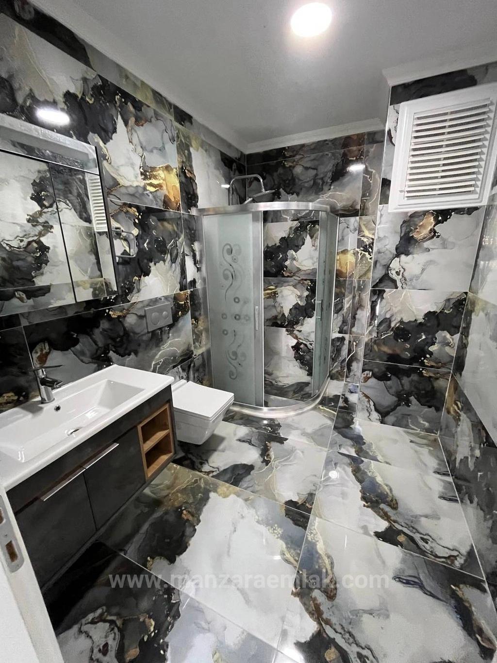 Dubleks daire, 190 m², üçüncü katta. Odalar ferah ve geniş, her odada banyo mevcut. Alışveriş merkezine ve çarşıya 2-3 dakika mesafede. Fotoğraflardan gözlemler: Çelik kapı (daire no 15), mermer merdiven ve paslanmaz çelik korkuluk bulunan bakımlı apartman girişi. İç mekanda gri laminat parke zemin, beyaz mutfak dolapları ve siyah tezgah arası, asma tavan mavi LED spot aydınlatma, parlak seramik zeminli koridor, beyaz iç kapılar. Daire sıfır/yeni yapı görünümünde, boş ve kullanıma hazır durumda.