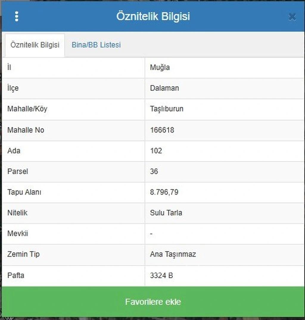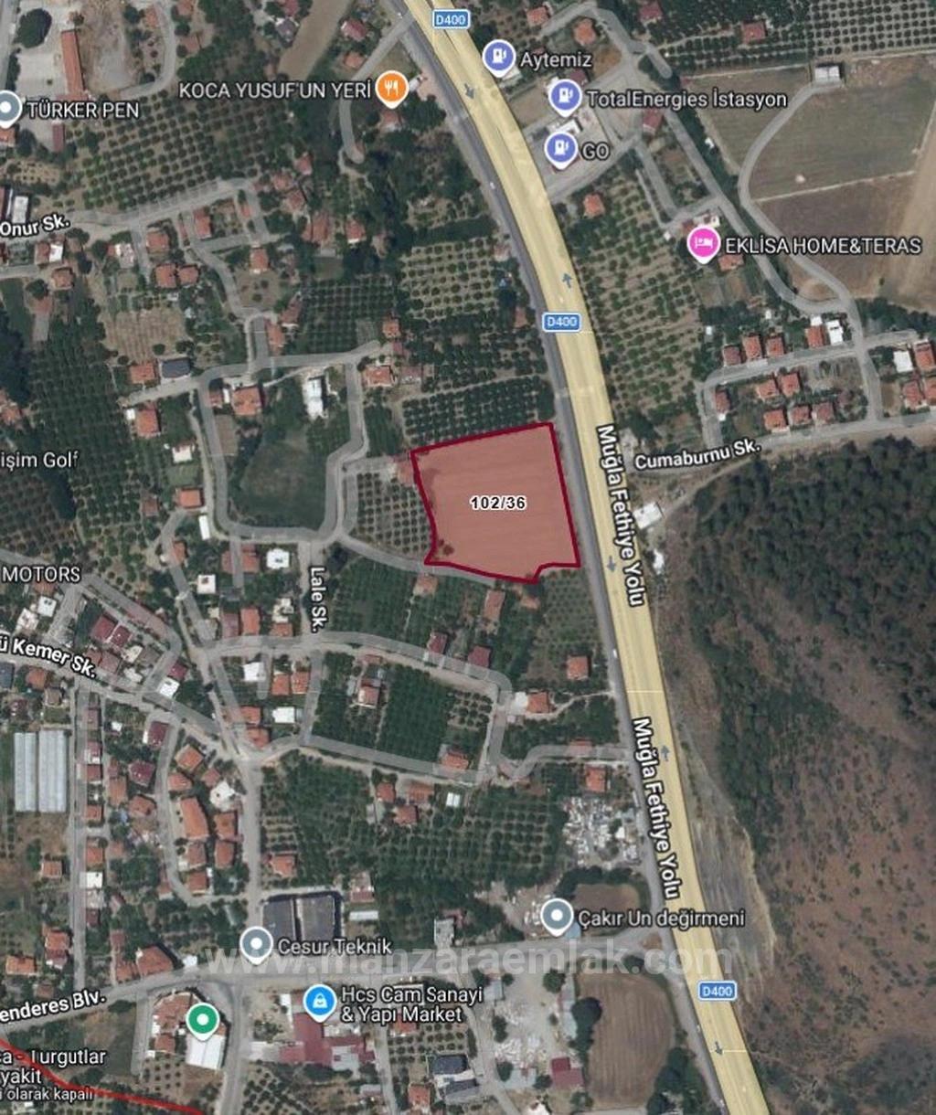 T2 ticari yer. 102 ada 36 parsel. Tapu alanı 8.796,79 m2, nitelik: sulu tarla, zemin tip: ana taşınmaz, pafta: 3324 B. Parsel D400 Muğla-Fethiye Yolu'na cepheli konumda, Cumaburnu Sokak ve Lale Sokak arasında yer almaktadır. Çevresinde ticari işletmeler (Total Energies İstasyon, Hcs Cam Sanayi, Cesur Teknik vb.) ve konut alanları bulunmaktadır.