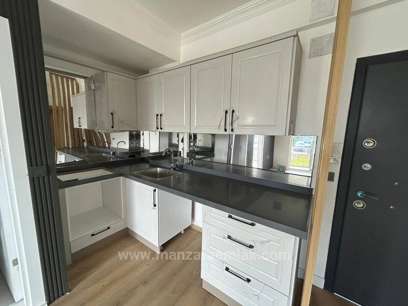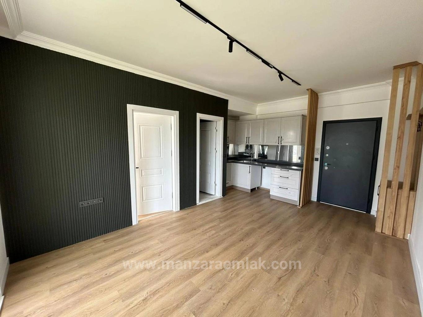 55 m2 brüt, 50 m2 net oturum alanı. Fotoğraflardan gözlemler: Salon ve açık mutfak birleşik alan, koyu yeşil/siyah yivli duvar paneli accent wall, açık renk meşe laminat parke, siyah ray spot aydınlatma sistemi, beyaz shaker tarzı mutfak dolapları, siyah granit tezgah, aynalı mutfak tezgah arası, beyaz panel kapılar, çelik giriş kapısı, doğal ahşap dekoratif separatör/bölücü, yatak odası beyaz yivli duvar paneli ile dekore edilmiş ve güneş alan pencereye sahip, banyo koyu tonlarda parlak seramik kaplama, asma tavan, duvar tipi klozet ve lavabo mevcut. Sıfır/yeni yapılmış daire, boş teslim.